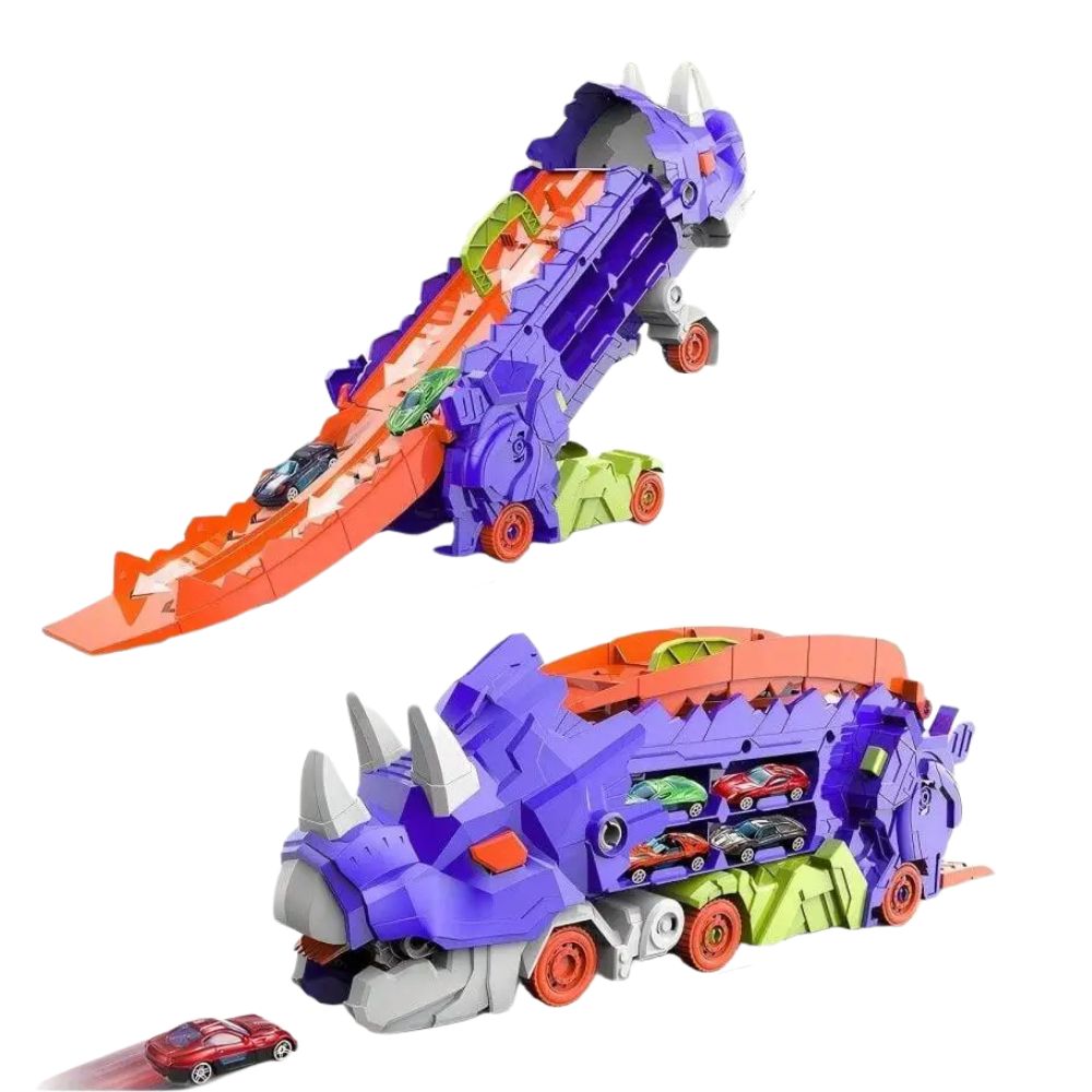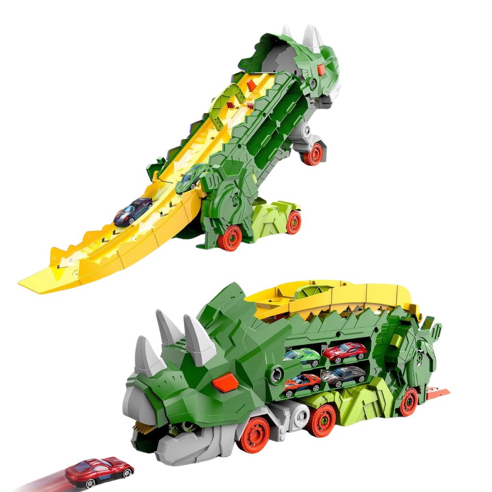 Erleben Sie das ultimative Spielerlebnis mit dem Dinosaurier-Transporter Schiebe-Rennbahn-Set, das sich nahtlos von einem coolen Transportwagen in einen stehenden Dino verwandelt. Perfekt für Kinder, die Abenteuer, Rennen und Dinosaurier lieben!