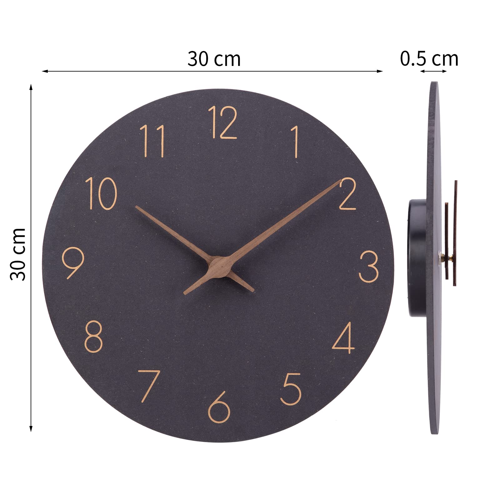 Wooden quartz wall clock (30cm) without ticking noise for living room, kitchen: battery operated