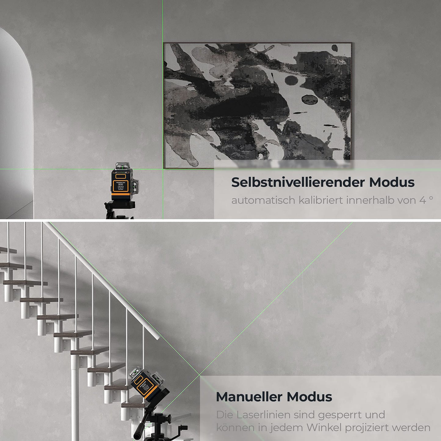 The 3x360° green laser projects one horizontal and two vertical lines that cover the entire room - ideal for interior work, tiling, drywalling and more .