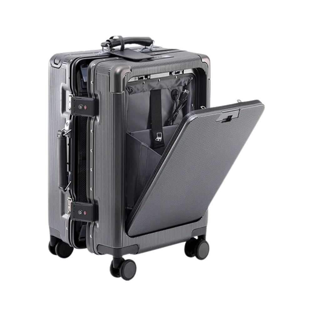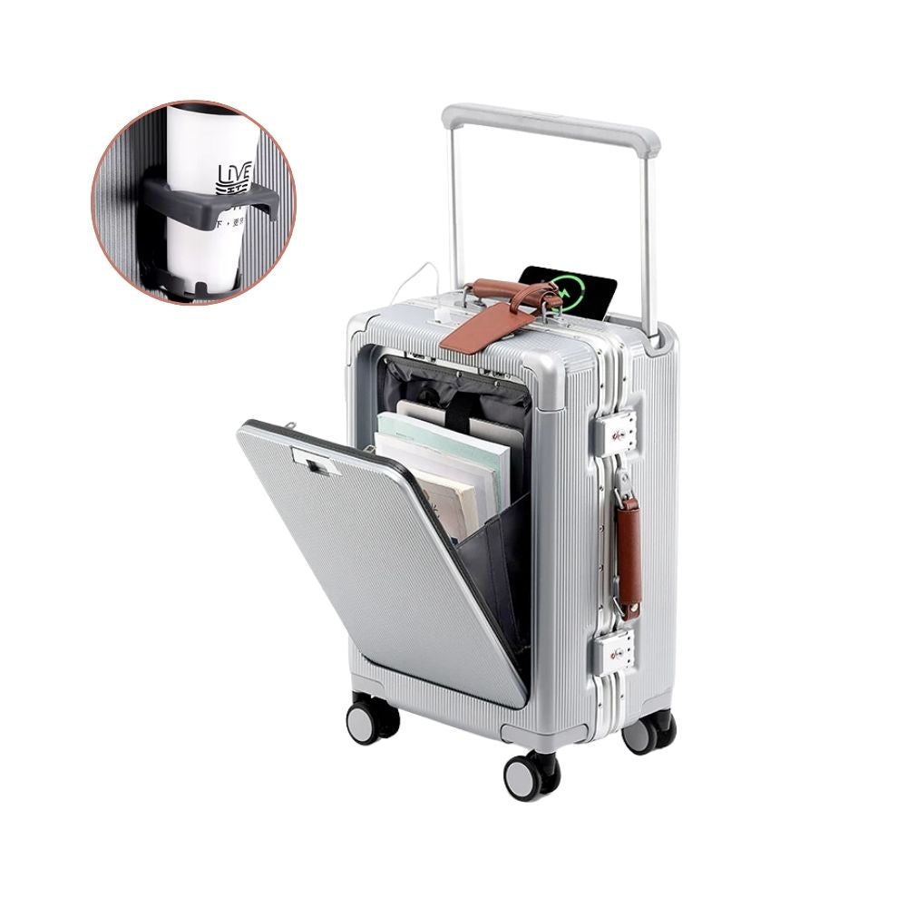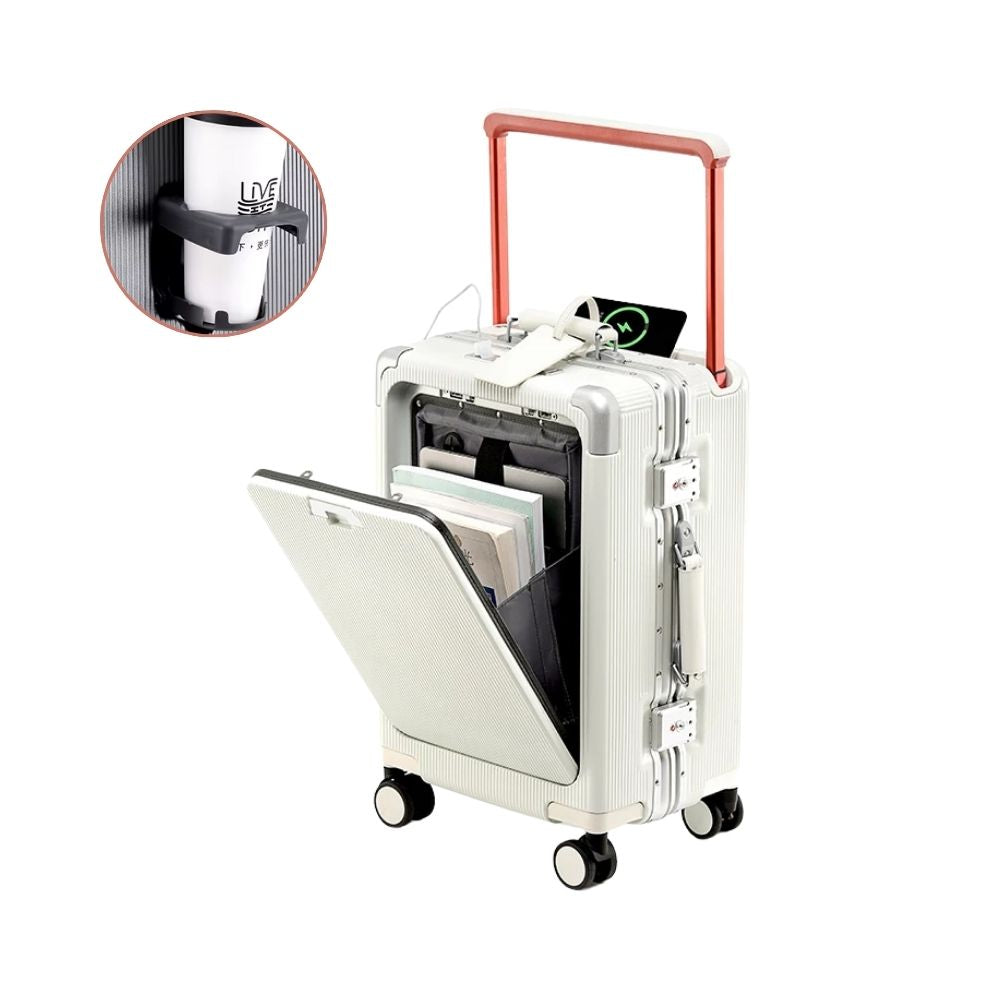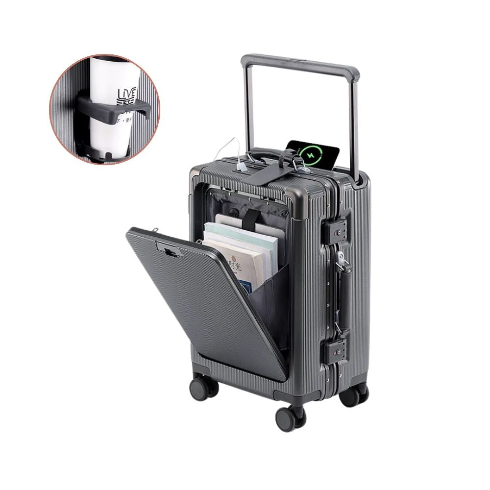 Multifunctional Trolley Suitcase with Front Opening | USB Port, Cup Holder, Hand Luggage & Travel Suitcase
