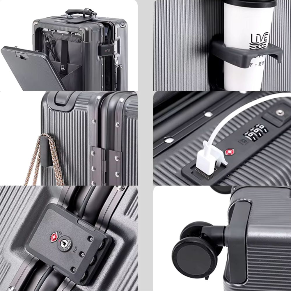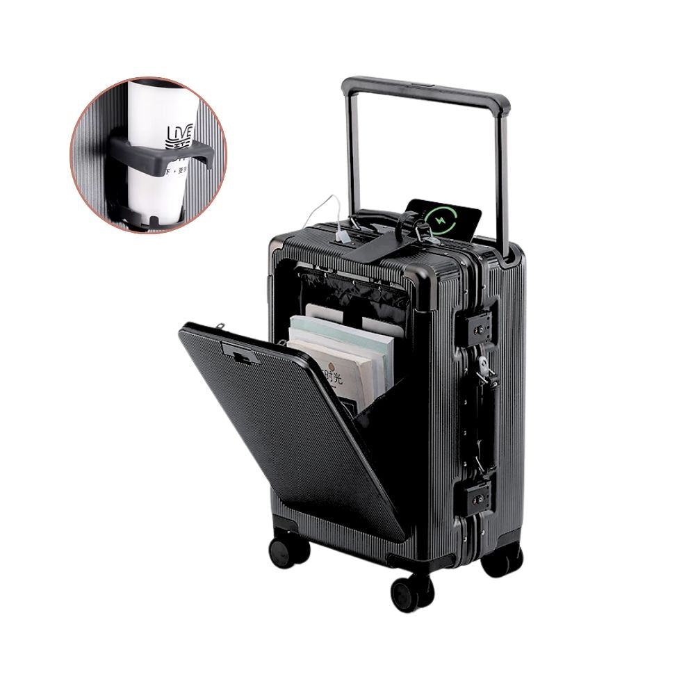 Multifunctional trolley suitcase with front opening | USB port, cup holder, hand luggage & travel suitcase
