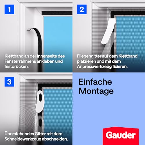 Das GAUDER Fliegengitter in Schwarz bietet effektiven Insektenschutz, ohne den Luftaustausch zu behindern. Mit einer Größe von 150 x 180 cm lässt sich das Netz individuell zuschneiden und passt somit an nahezu jedes Fenster. Die Montage erfolgt schnell und werkzeuglos mithilfe des mitgelieferten selbstklebenden Klettbands – ganz ohne Bohren. Für eine gleichmäßige Befestigung sorgt das praktische Anpresswerkzeug, das im Lieferumfang enthalten ist. Das robuste Polyester-Gewebe mit hexagonaler Struktur bietet dauerhafte Stabilität und hält selbst kleinste Insekten zuverlässig ab.