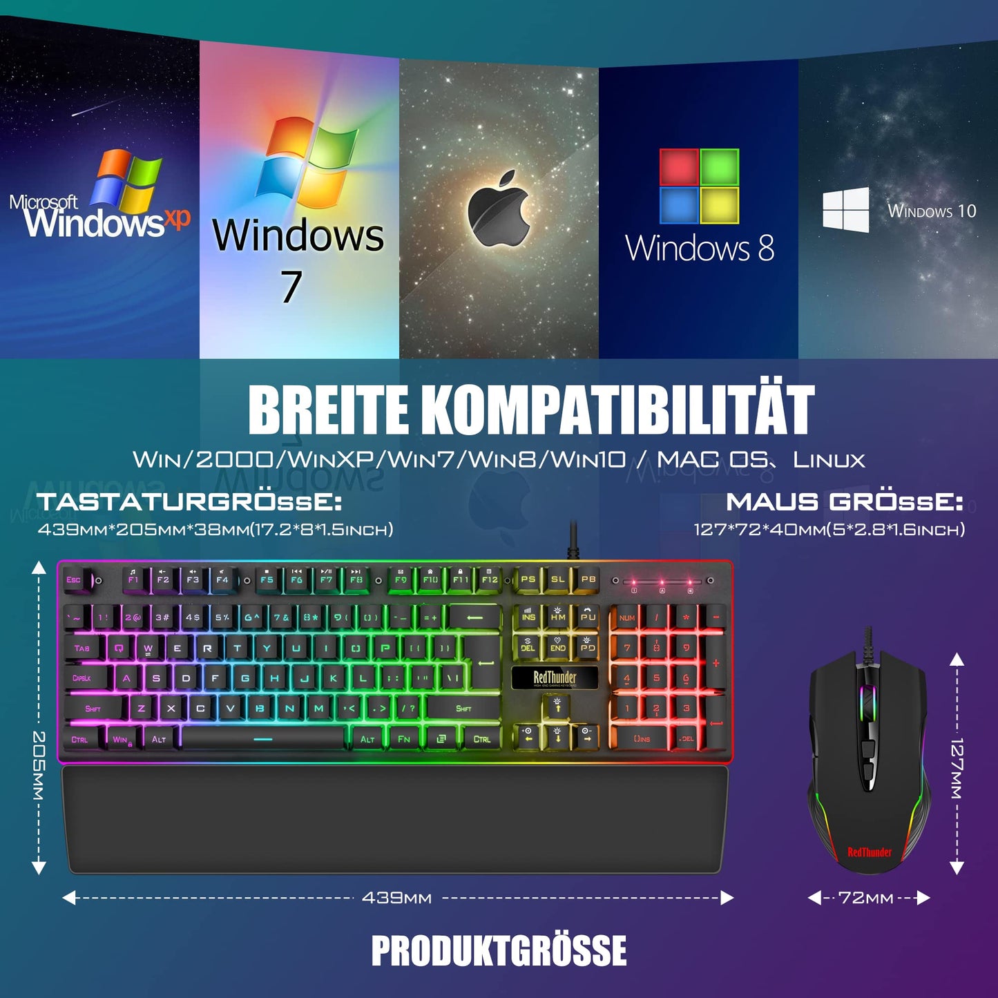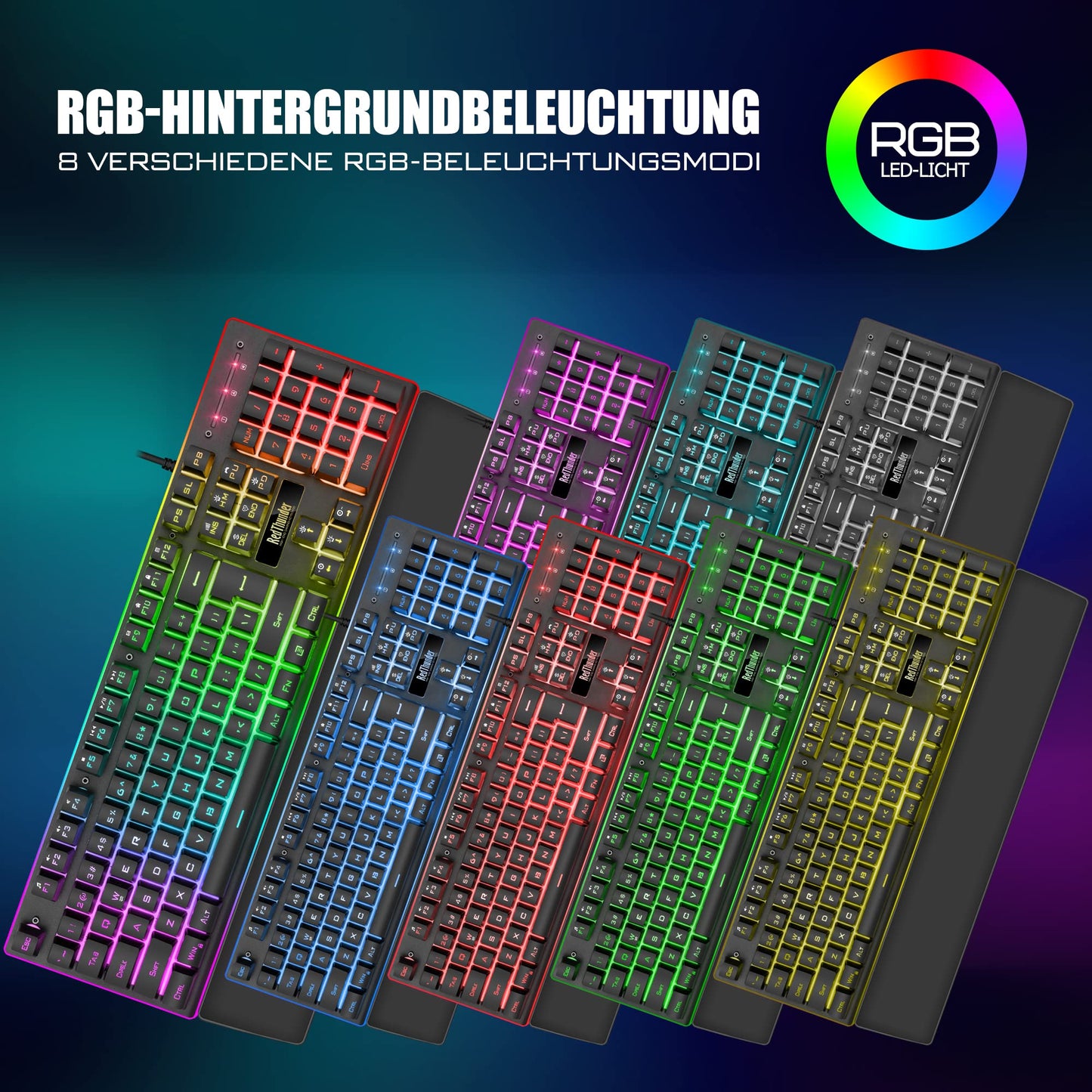RedThunder K10 Gaming Tastatur und Maus Set, QWERTZ DE-Layout, Metallplatte und Handballenauflager,RGB-Hintergrundbeleuchtung und 7D mit Ergonomische für PC Gamer(Schwarz)