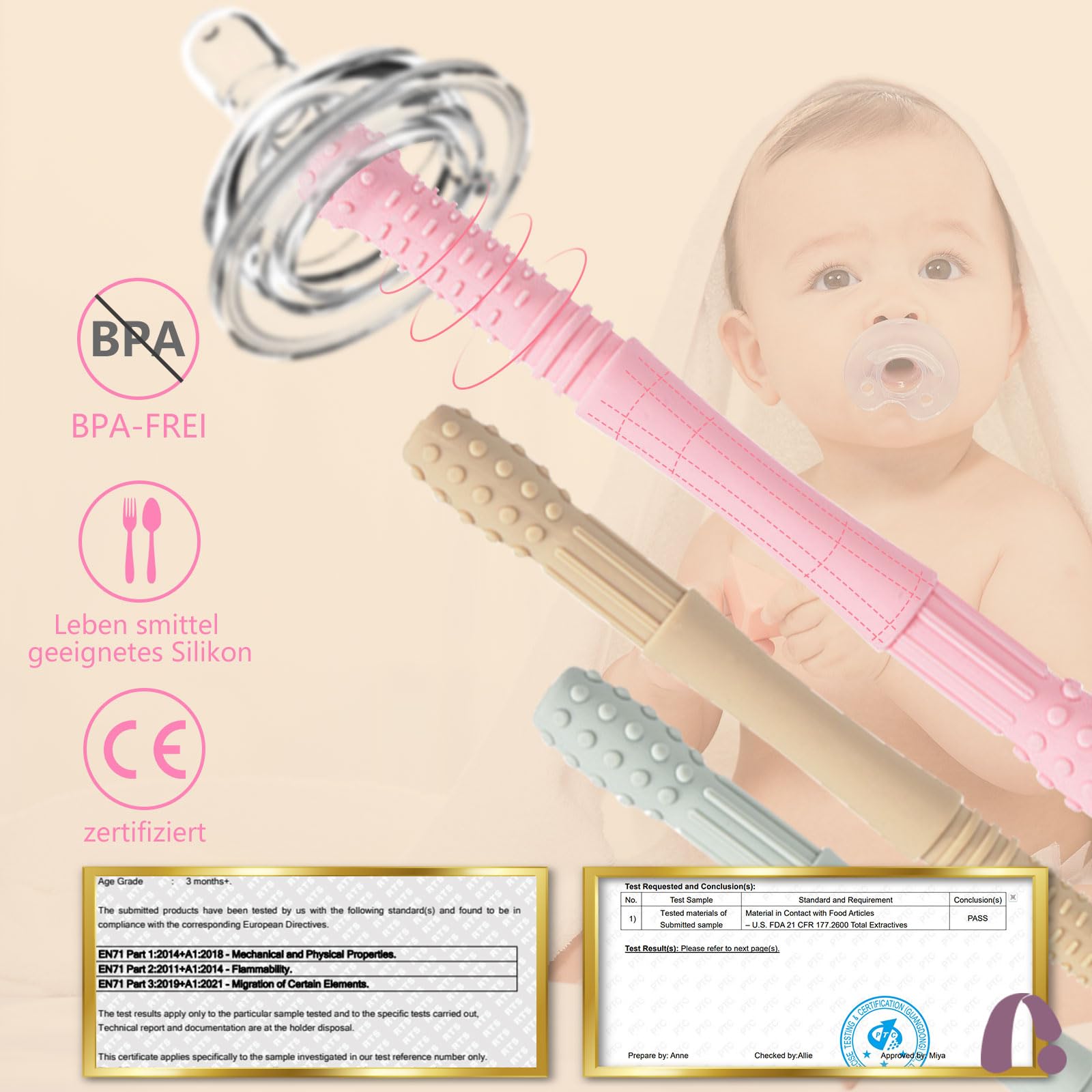 Hergestellt aus lebensmittelechtem Silikon, sind sie zu 100 % frei von Blei, BPA und PVC und damit sicher für den täglichen Gebrauch. Das ergonomische Design mit einer Länge von 17 cm und 1 cm Durchmesser ist optimal für kleine Babyhände und passt in jede Wickeltasche.