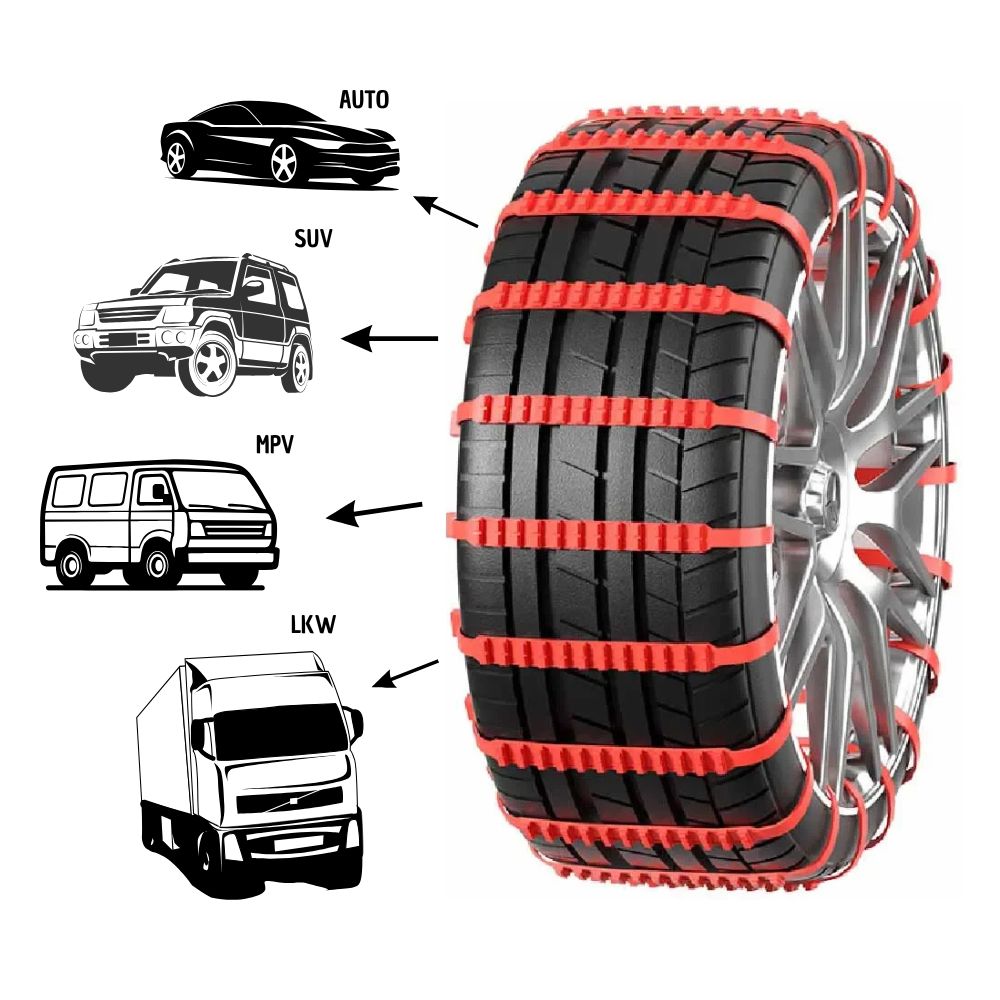 Grâce à la surface antidérapante, les chaînes à neige augmentent la friction entre les pneus et la route. Ils offrent une protection fiable sur la neige, la glace ou les surfaces boueuses et garantissent un voyage en toute sécurité.