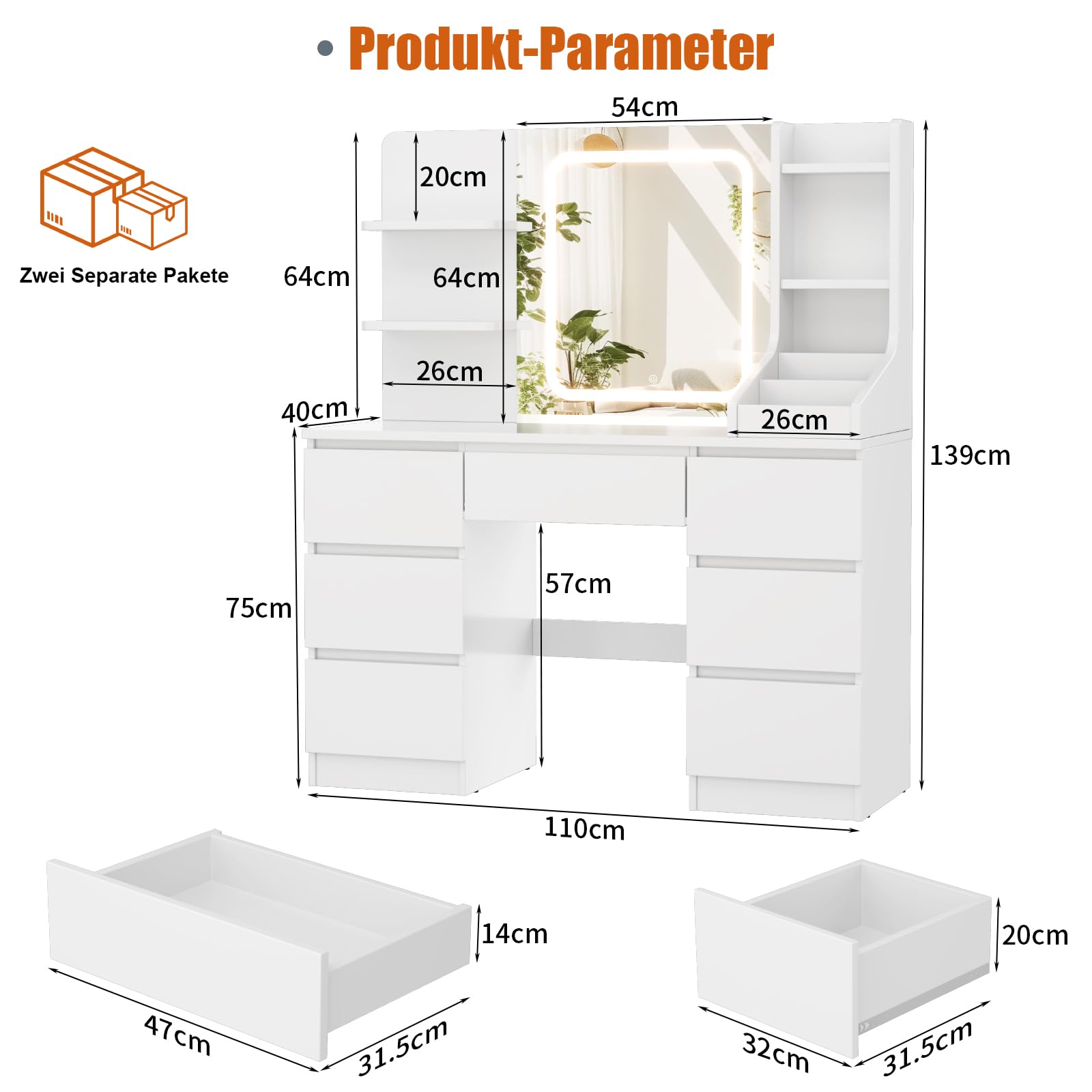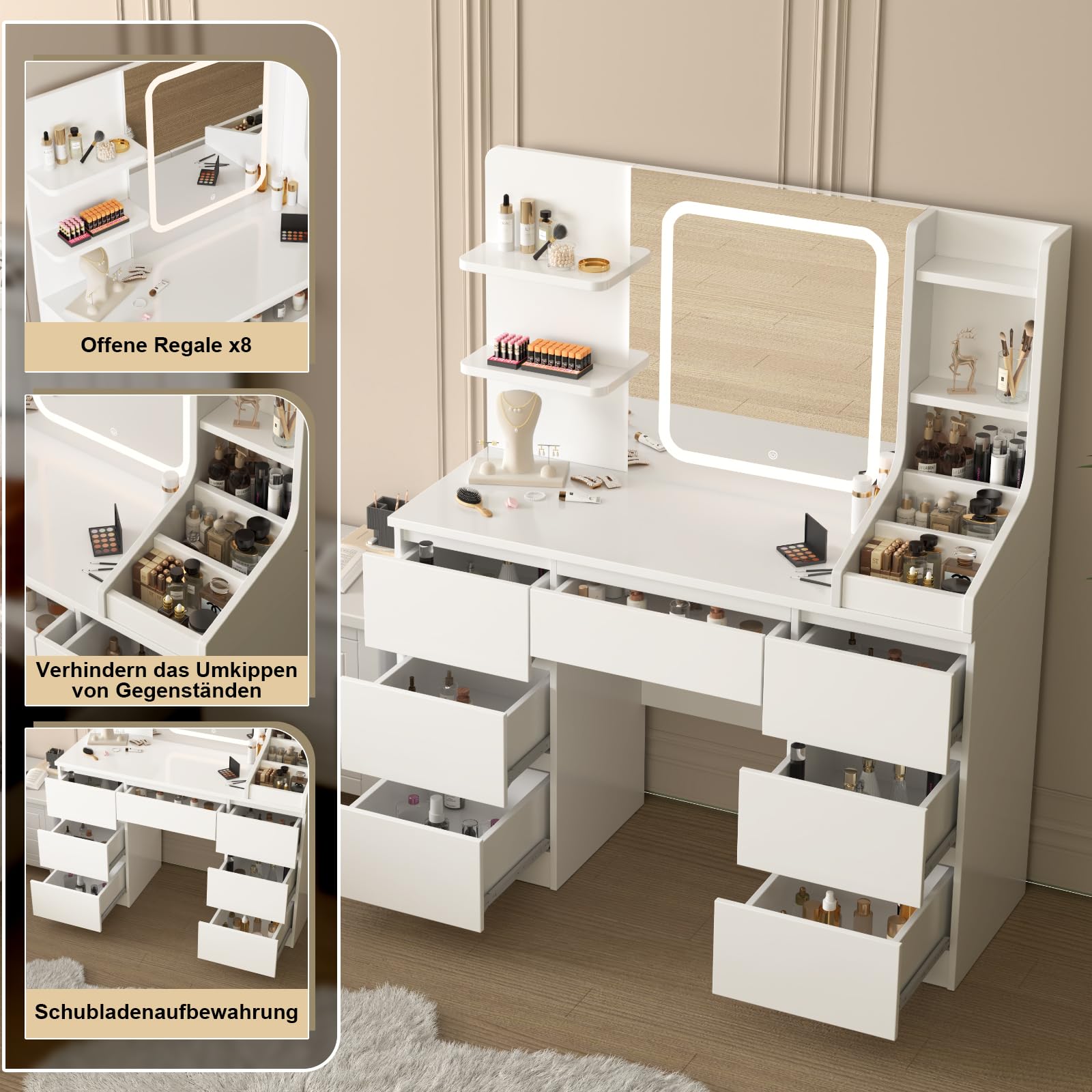 TRIUMPHKEY Schminktisch mit LED-Beleuchtung | 7 Schubladen, Touch-Spiegel