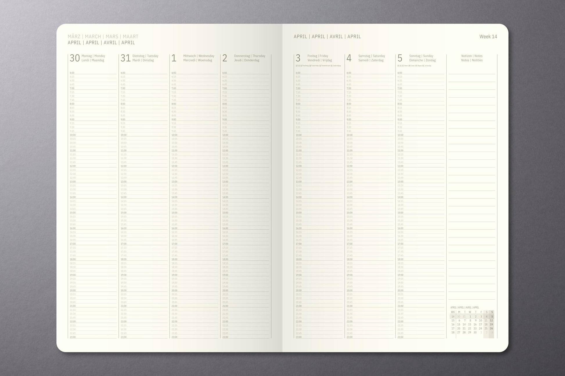 - Kalendarium: 1 Woche auf 2 Seiten + separate Notizspalte