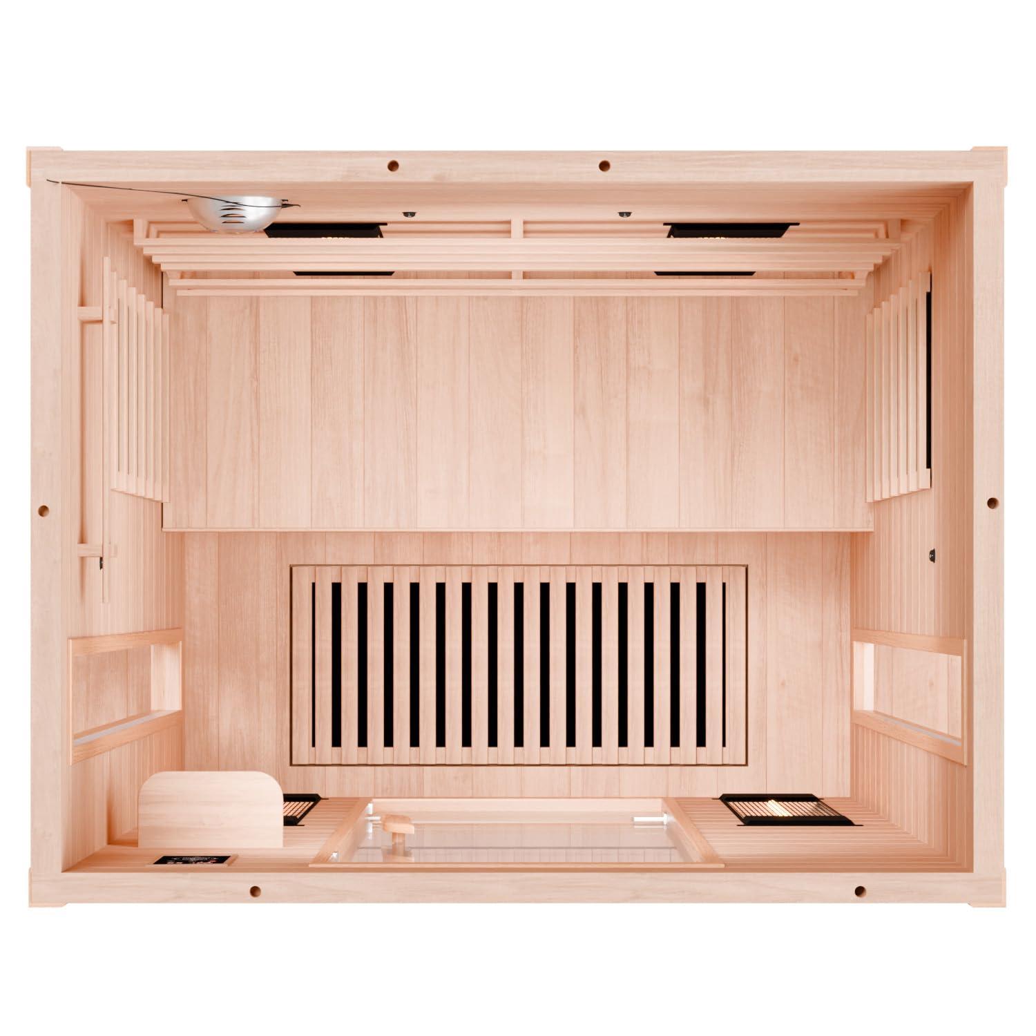 5 Vollspektrumstrahler + 3 Karbonstrahler (seitlich & im Boden) für gezielte Tiefenwärme. -